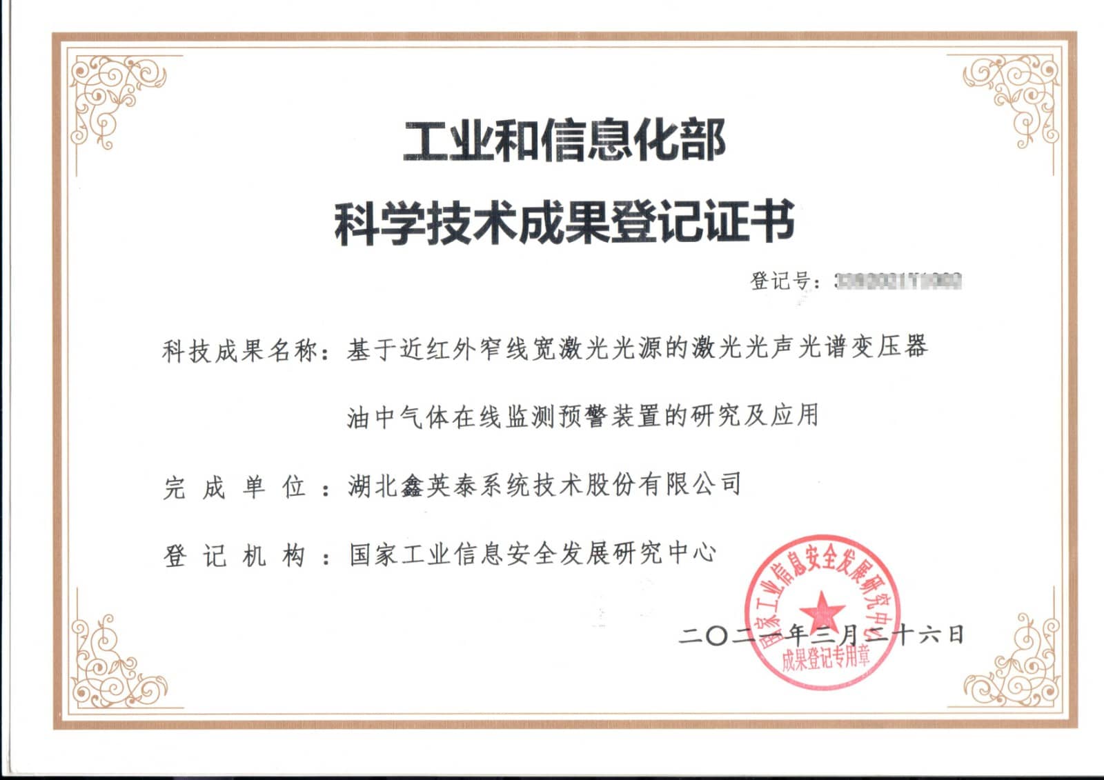 报告评定:项目整体达到国际先进水平,自主研发微体积光声池技术性能指标等达到国际领先水平,将DFB激光光源应用于变压器油中气体检测和在线监测领域属国际首创,成果被科技部确认为国家科学技术成果,并通过国家工信部科技成果登记。